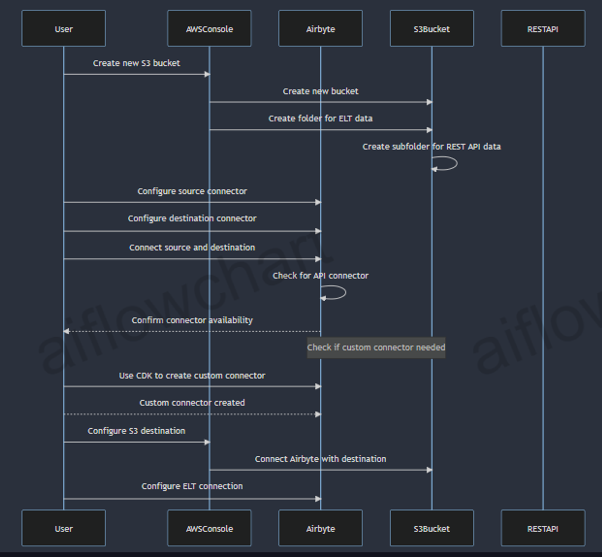 Let’s say for example using a REST API as a data source, Airbyte as the ELT tool and Amazon S3 bucks as the data destination. Create a new S3 bucket in the AWS console, in the bucket, create a folder to store data from the ELT operation in Airbyte. Create another folder in the previous folder to store the data you will extract from the REST API.