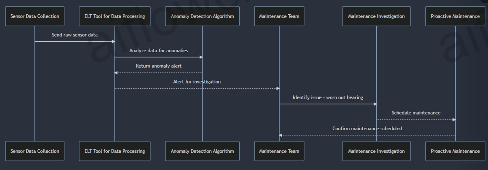 Imagine a manufacturing company that collects sensor data from various manufacturing plants across facilities. If analysis, reveals one machine is giving higher vibration levels than others. The ELT tool anomaly detection algorithm should trigger an alert which will prompt the maintenance team to investigate. They might identify a worn-out bearing component and schedule proactive maintenance, preventing equipment failure and uninterrupted production.