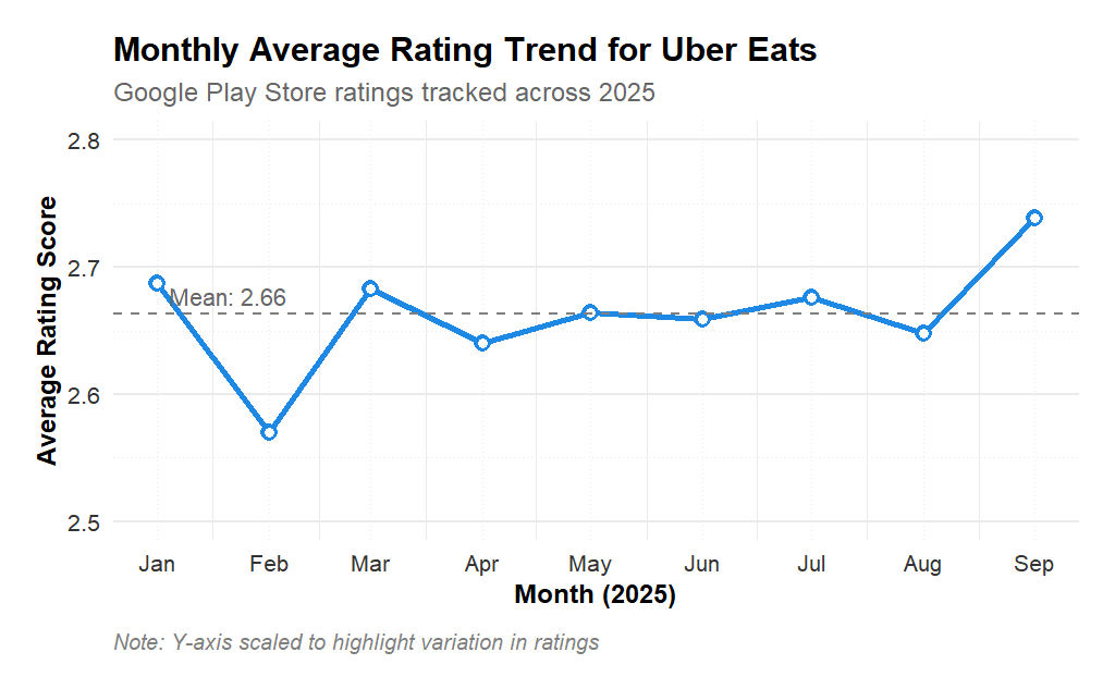 Uber Eats ratings faced a drastic drop in February 2025, but went back up the following month. Their current highest average monthly rating is on Septemeber, which is a possible sign of improvements on the application from customers’ reviews.